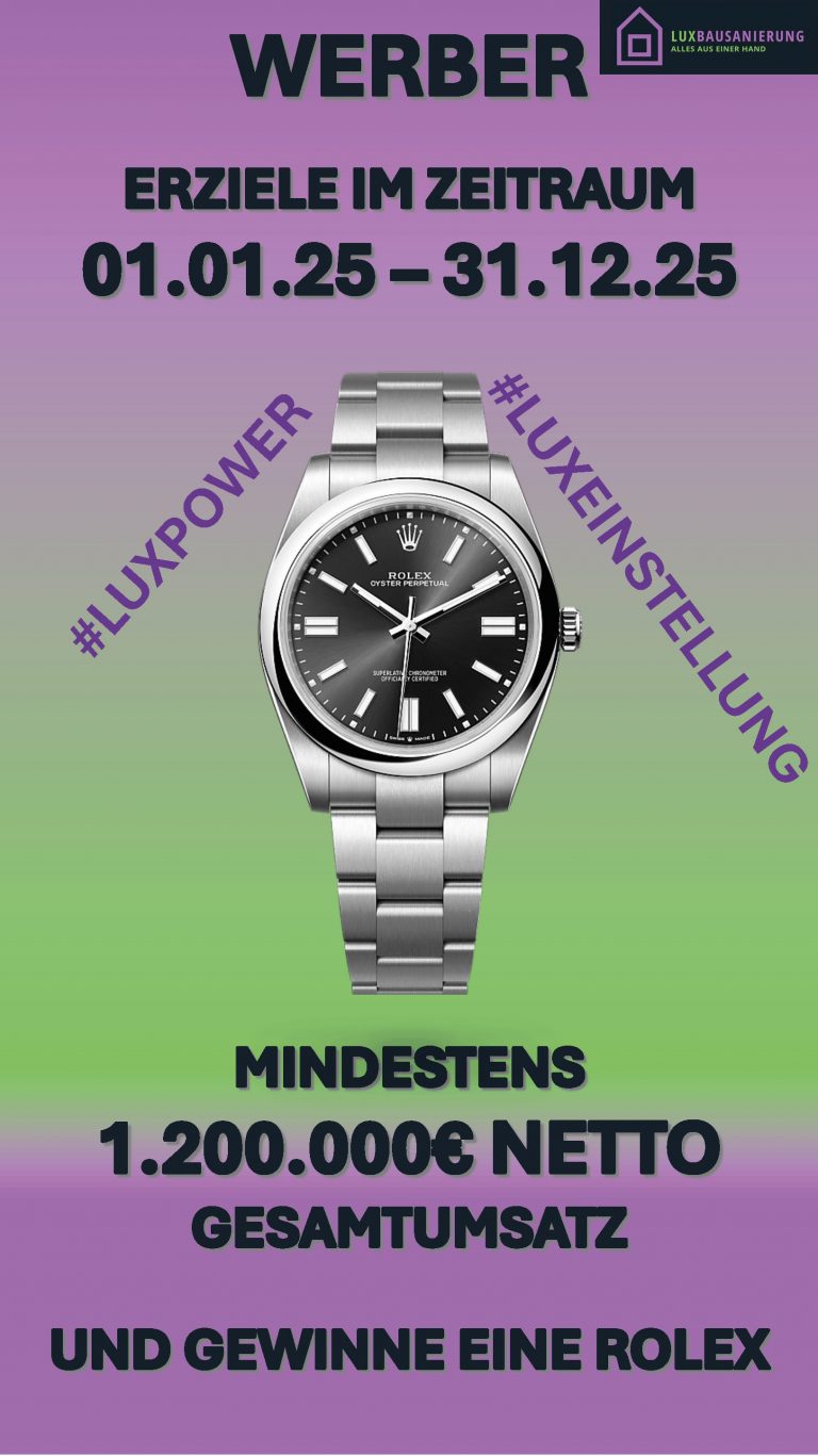 LuxKarriere bietet ambitionierten Büroleitern eine einmalige Chance: Erziele im Zeitraum vom 01.01.2025 bis zum 31.12.2025 einen Nettogesamtumsatz von mindestens 2.500.000 € und gewinne eine exklusive Rolex!