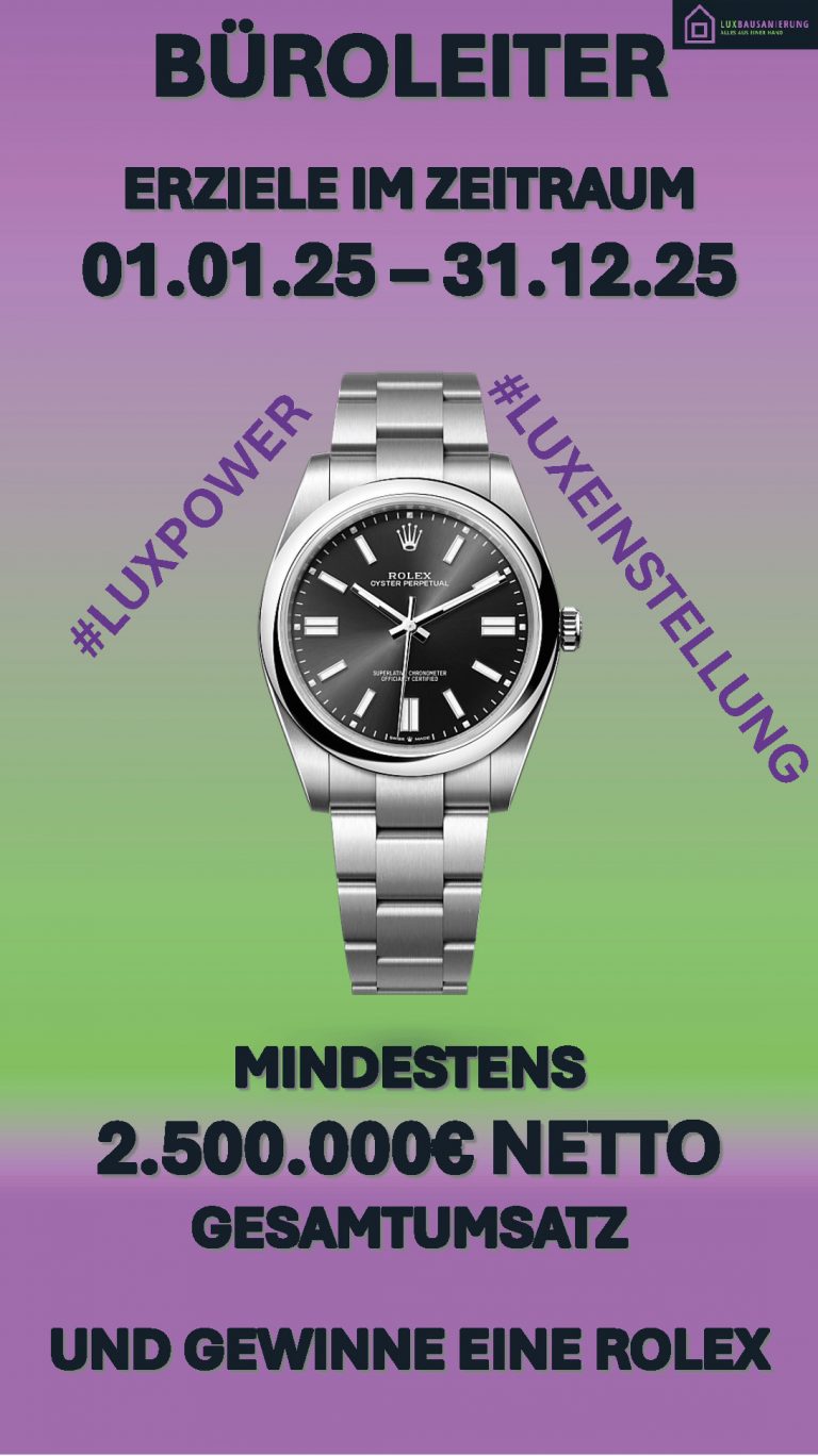 LuxKarriere bietet allen Werbern eine außergewöhnliche Gelegenheit: Erziele im Zeitraum vom 01.01.2025 bis zum 31.12.2025 einen Nettogesamtumsatz von mindestens 1.200.000 € und gewinne eine begehrte Rolex!